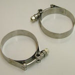 | Stainless Steel T-Bolt Clamps 3" Pair T-Bolt Clamps offer superior tensile strength and durability compared to worm gear clamps. Ideal for medium and heavy duty applications, including high boost. Vibrant T-Bolt Clamps feature a "Floating Bridge" design to prevent against hose buckling when clamp is torqued. Full 300 Series construction (including the bolt and lock nut) for outstanding corrosion resistance. Always Use T-Bolt Clamps when clamping reinforced silicone turbo hoses. |